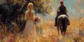 Romantic Rural Scene with Couple and Horse Amidst Blooming Meadow
