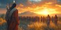 Majestic Twilight: Warriors Overlooking the Fiery Horizon