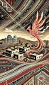 Majestic Bird Illustration Overlooking Stylized Phoenix Cityscape