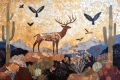 Majestic Desert Mosaic: Deer, Cacti, and Mountain Sunset