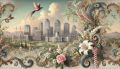 Ethereal Dreamscape Fusing Urban Skyline with Vivid Feathers