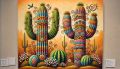 Vibrant Saguaro Cacti Embodying Folk Art and Calligraphy Inspirations
