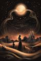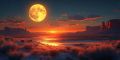 Surreal Desert Sunset with Luminous Moon and a Lone Wanderer