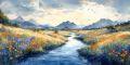 Serene Waterway Amidst a Blossoming Landscape Under Majestic Mountains