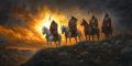Majestic Twilight: Warriors Overlooking the Fiery Horizon