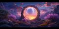 Ethereal Sunrise Through a Gigantic Stone Portal in a Fantasy Landscape